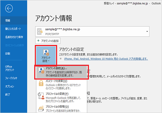 Outlook2019 2016 メール設定の確認 変更方法 Pop よくある質問 Faq Biglobe会員サポート